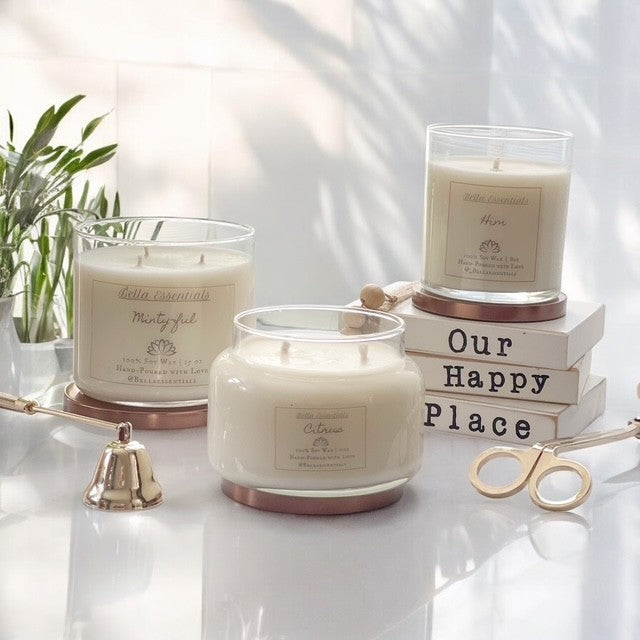 Burn within sight. Keep away from flammable objects, children, and pets. Trim wick to ¼ inch before lighting. Do not burn longer than 3–4 hours. Discontinue use when ½ inch of wax remains. Not evaluated by the FDA. Not intended to diagnose, treat, cure, or prevent any disease. Bella Essentials is not responsible for damage or injury caused by improper use, failure to follow instructions, or unsafe burning conditions.